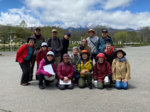 思いがけない寒い日となりましたが八ヶ岳自然クラブの佐藤さんにガイドを頂き山野草ガイドを頂きました。 雪を被った八ヶ岳をバックに集合写真を撮影しました。昨夜の雨を吹き飛ばした参加者の皆様に心から感謝です。