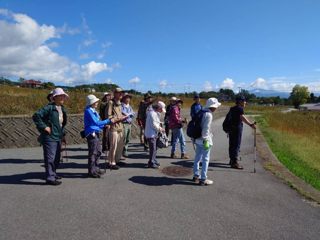 前半は三分一湧水を見学し、由来、仕組み、災害の話、この地での農業用水を巡る色々話がありました。開けた農道に出ると四方に広がる南アルプスなどの山々を見ながらの話が広がりました。