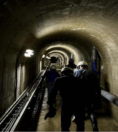 このトンネルはダムを維持管理するために設けられたもので、湖底の水深が最も深い処を通っています。トンネル内の温度は一年中一定で夏は涼しく冬は温かいそうです。急な階段や斜路が続き、皆さんは注意して上がったり下ったりして移動することになりました。思いもよらない運動になりましたが、ダムの胎内めぐりのような貴重な体験が出来て良かったと思います。