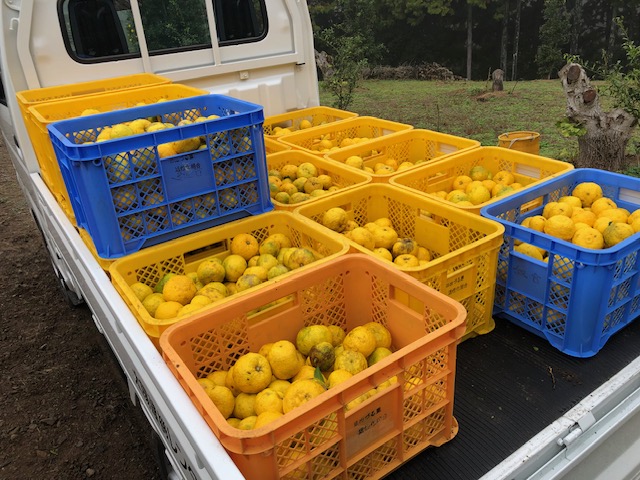 今年は、柚子の出来が大不作といえる程、柚子畑に黄色の実がならなかったそうです。そんな中、一部の畑だけに実が付き、その場所で貴重な柚子を傷つけないように丁寧に収獲しました。